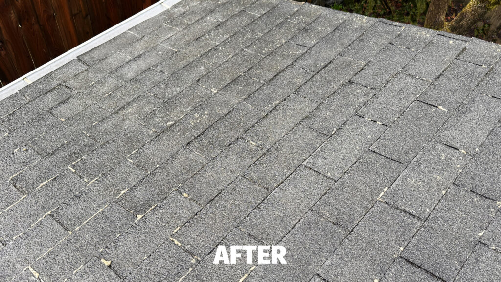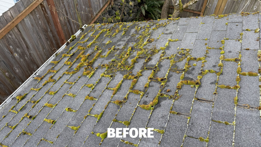 BEFORE – shows the original buildup of moss, algae and lichen on roof shingles, which shorten the life of the roof