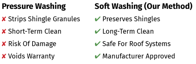 Our soft wash method is the Gold Standard for roof care. It’s recommended by industry experts for safely maintaining your roof and prolonging its life. Never pressure wash your roof—always soft wash.